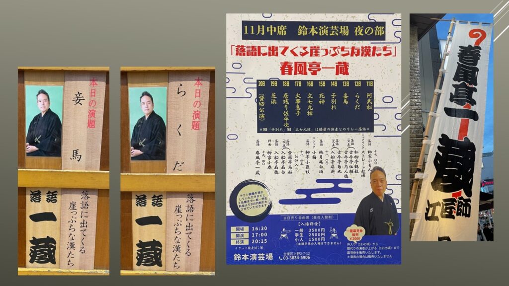 上野鈴本演芸場十一月中席三日目夜の部に行きました。今席は春風亭一蔵師匠が主任を勤め、「落語に出てくる崖っぷちな漢たち」と題したネタ出し興行だ。きょうは「妾馬」だった。