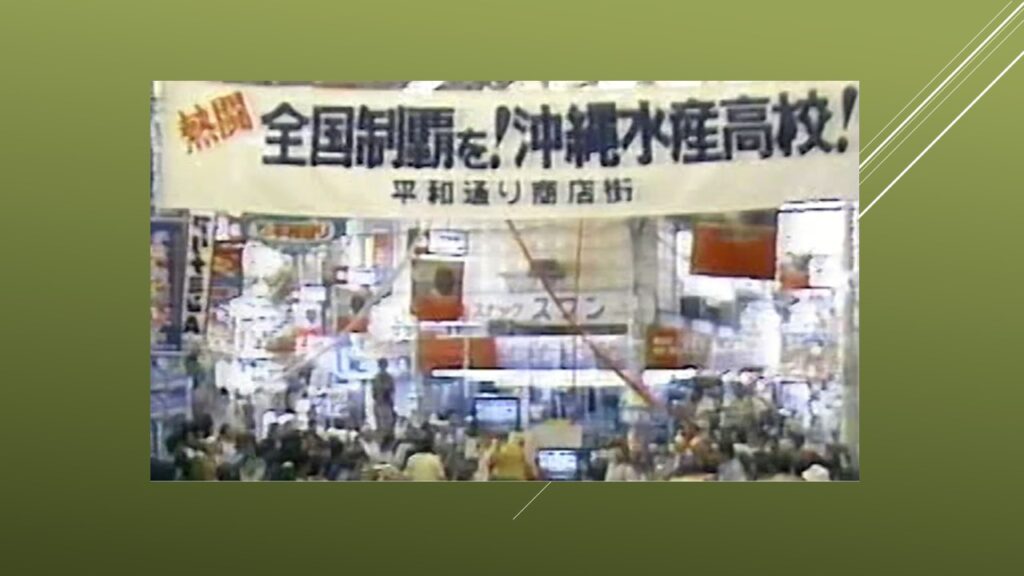 1990年夏。本土復帰の年に生まれた野球部員たちが快進撃を続け、初の決勝進出を果たした。8月21日。初の頂点まであと一歩である。5万5千人の観客席はもちろん、地元沖縄那覇の平和通り商店街の応援もボルテージが最高潮に達した。相手は奈良代表の天理高校。4回に犠牲フライで先制されるも、その後は投手戦が続き、0-1のまま9回裏の攻撃を迎えた。2アウト二塁。バッターは横峰。このとき普段吹いている浜風とは逆の向かい風が吹き、ホームラン性の打球は惜しくもレフトフライに終わった。