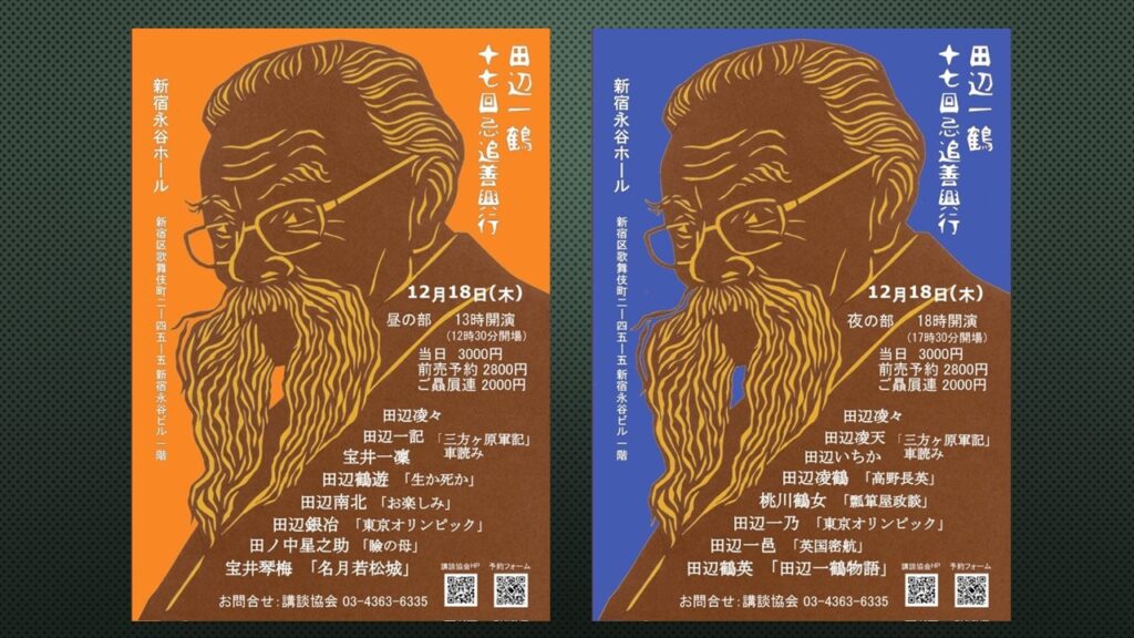 夜の部 「三方ヶ原軍記」田辺凌々~田辺凌天~田辺いちか/「高野長英 水沢村涙の別れ」田辺凌鶴/「瓢箪屋政談」桃川鶴女/中入り/「東京オリンピック」田辺一乃/「英国密航」田辺一邑/「田辺一鶴物語」田辺鶴英