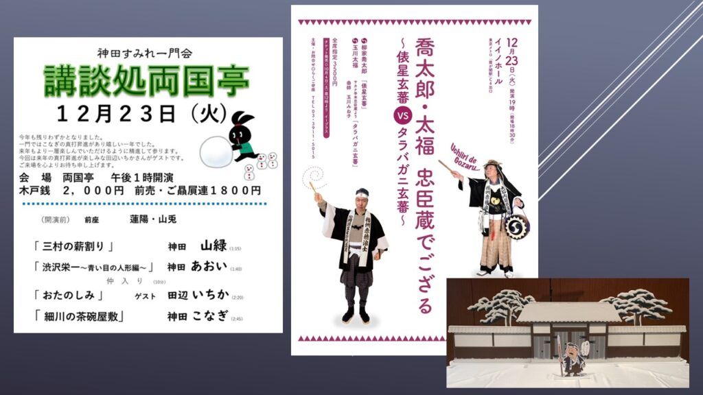 神田すみれ一門会 神田あおい「渋沢栄一と青い目の人形」、そして忠臣蔵でござる 柳家喬太郎「俵星玄蕃」