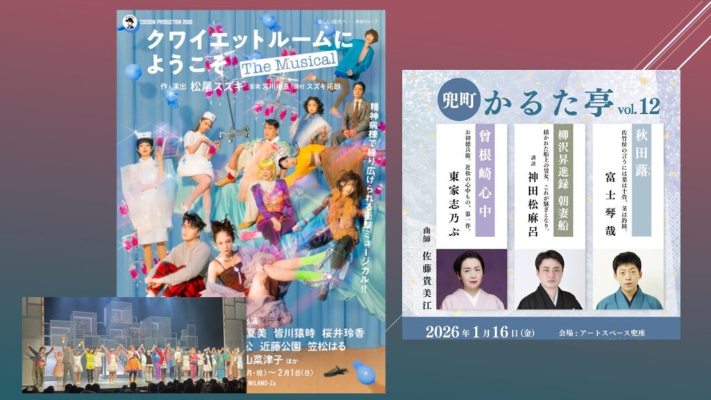 ミュージカル「クワイエットルームにようこそ」、そして兜町かるた亭 東家志乃ぶ「曾根崎心中」