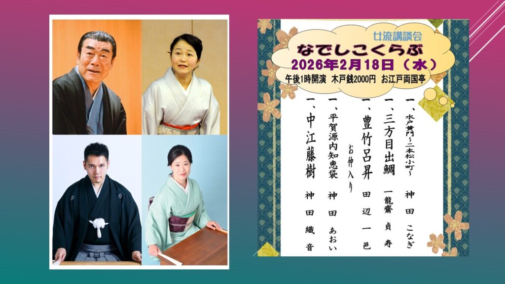なでしこくらぶ 神田あおい「平賀源内 知恵袋」、そして夢空間講談会 田辺一邑「良弁杉の由来」神田松鯉「天野屋利兵衛」