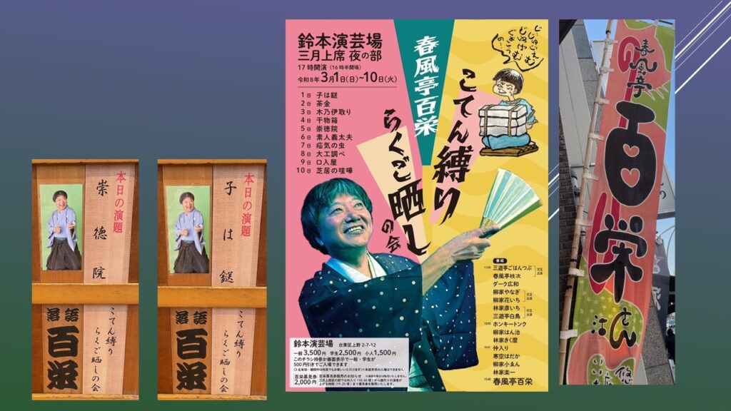 上野鈴本演芸場三月上席中日夜の部に行きました。今席は春風亭百栄師匠が主任を勤め、「こてん縛り らくご晒しの会」と題したネタ出し興行だ。きょうは「崇徳院」だった。