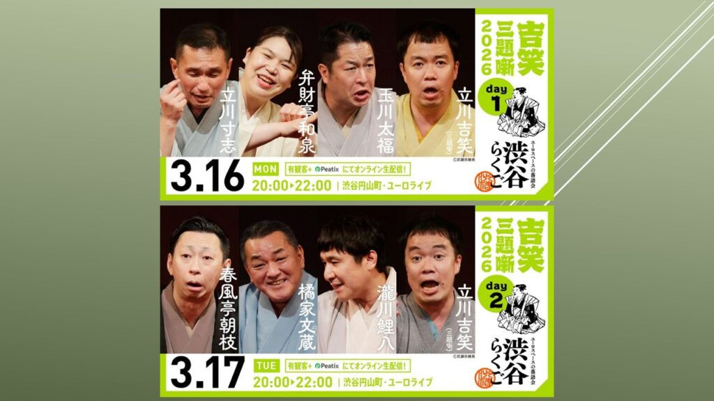配信で「渋谷らくご 立川吉笑三題噺2026 DAY1」を観ました。吉笑師匠が三題噺に挑戦する二日間の初日。会場のお客様が提出したお題の中から3つを無作為に選んだ後、「小林」立川寸志、「ラジオデイズ」弁財亭和泉、「石松三十石船道中」玉川太福(曲師・伊丹明)と三人が高座を勤める間の90分での創作だ。