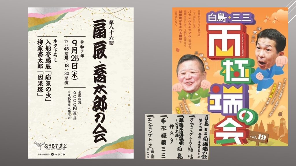 「白鳥・三三 両極端の会」に行きました。柳家三三師匠から三遊亭白鳥師匠への宿題は米問題の噺、白鳥師匠から三三師匠への宿題は実録風現代ホラーであった。