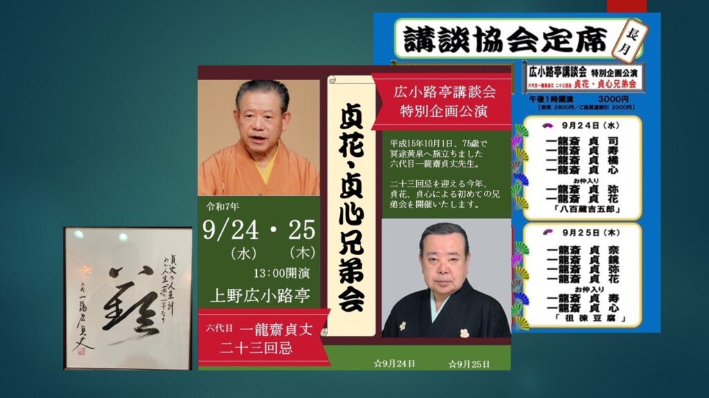 上野広小路亭講談協会定席「貞花・貞心兄弟会」初日に行きました。六代目一龍斎貞丈先生の二十三回忌、孫弟子の貞寿先生が企画した。何と兄弟会を開くのは初めてのことだそうだ。