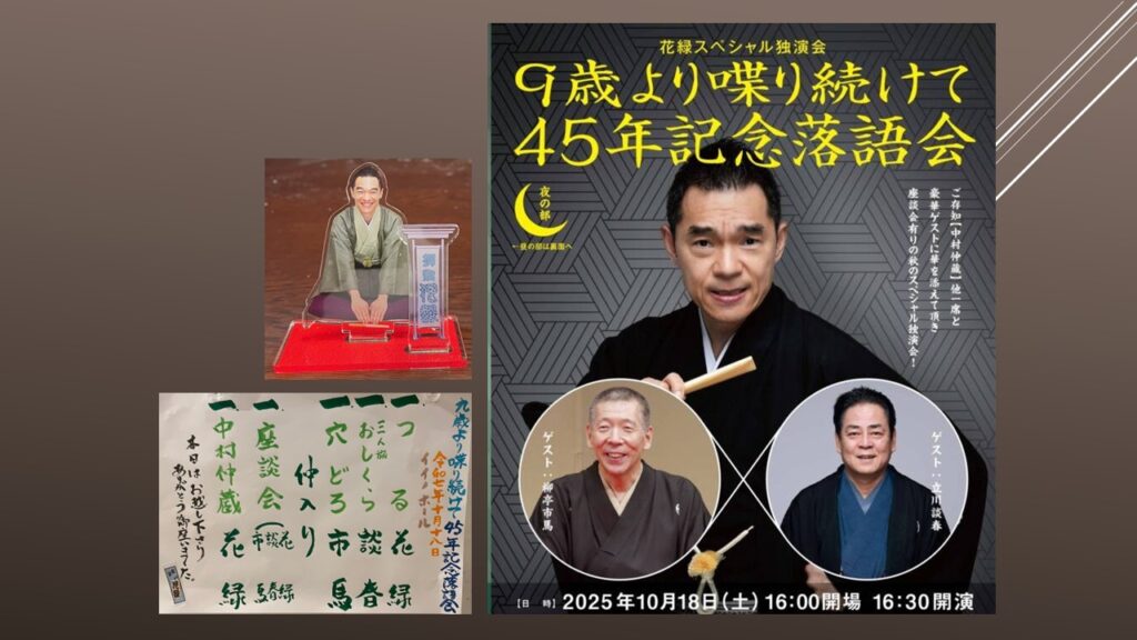 花緑師匠は中学を卒業して、祖父の五代目柳家小さんに入門した。だから、芸歴では45年ではない。だが、小学校3年生のときに初めて叔父にあたる三語楼師匠(現六代目小さん)に落語「穴子でからぬけ」を習って、客前で演じた。それから数えて45年というわけだ。その後、「桃太郎」も習い、祖父の小さん師匠からは「芋俵」を初めて習ったという。