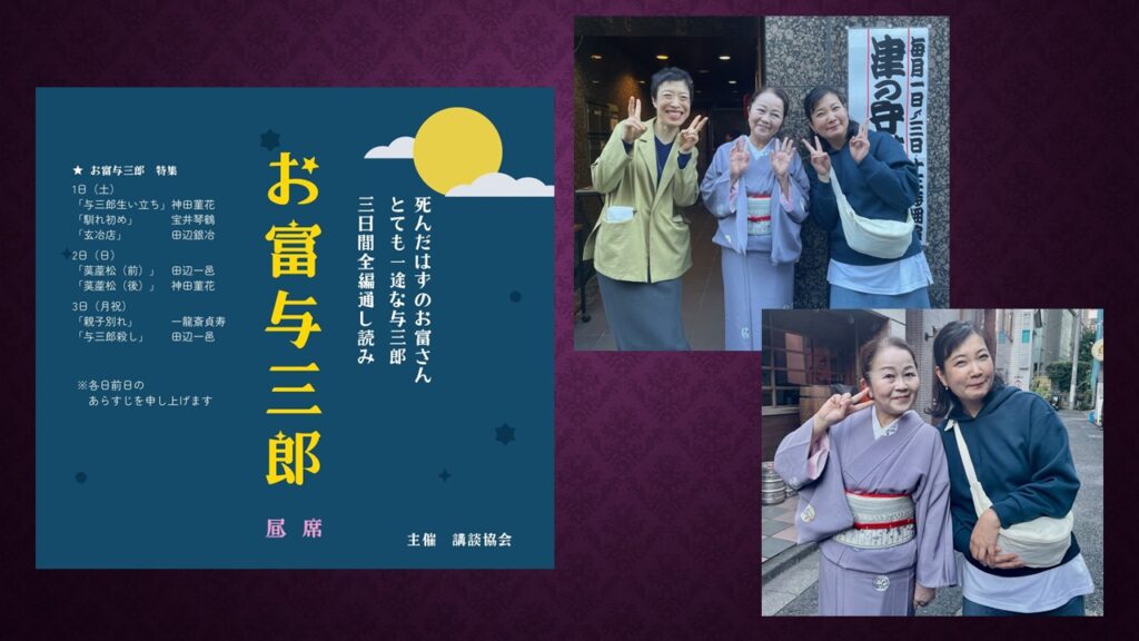 津の守講談会三日目に行きました。中入り後は「お富与三郎」連続口演の最終日である。